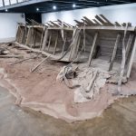 Recycled wood in concrete, concretised canvas, suitcases and clothes, sand