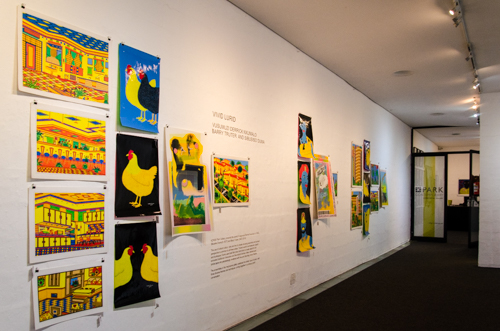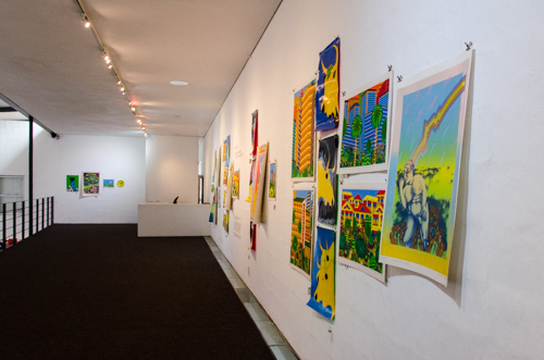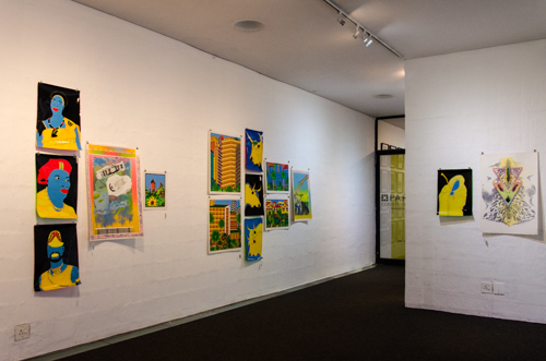The use of vibrant colour, dots and line to create amusing scenarios and surreal perspective is common to all three artists. Truter’s work is luminescent, playful and burlesque, Duma uses bold flat colour and dots to create depth for his animated traditional characters and Nxumalo’s fantasy cities, interiors and landscapes are painstakingly rendered with line and dazzling colour blocks.